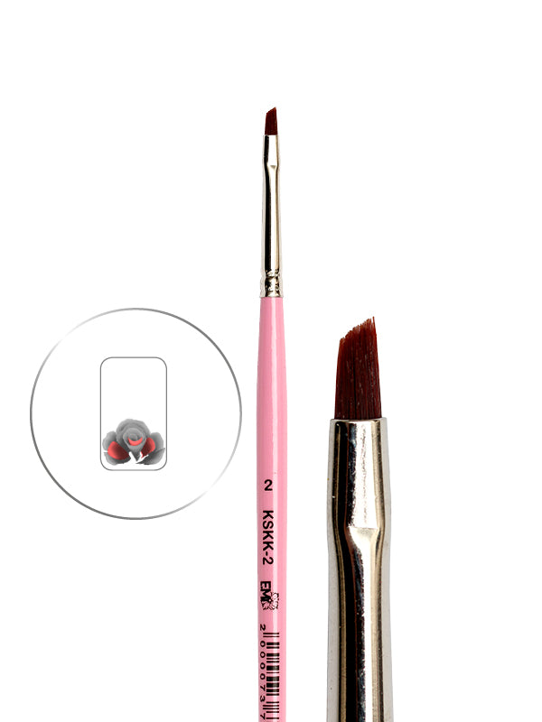 Flache, breit abgeschrägte Bürste mit rotem Flor, hergestellt aus synthetischem „Torey“. Der Pinsel ist zum Malen in einem Zug konzipiert.
